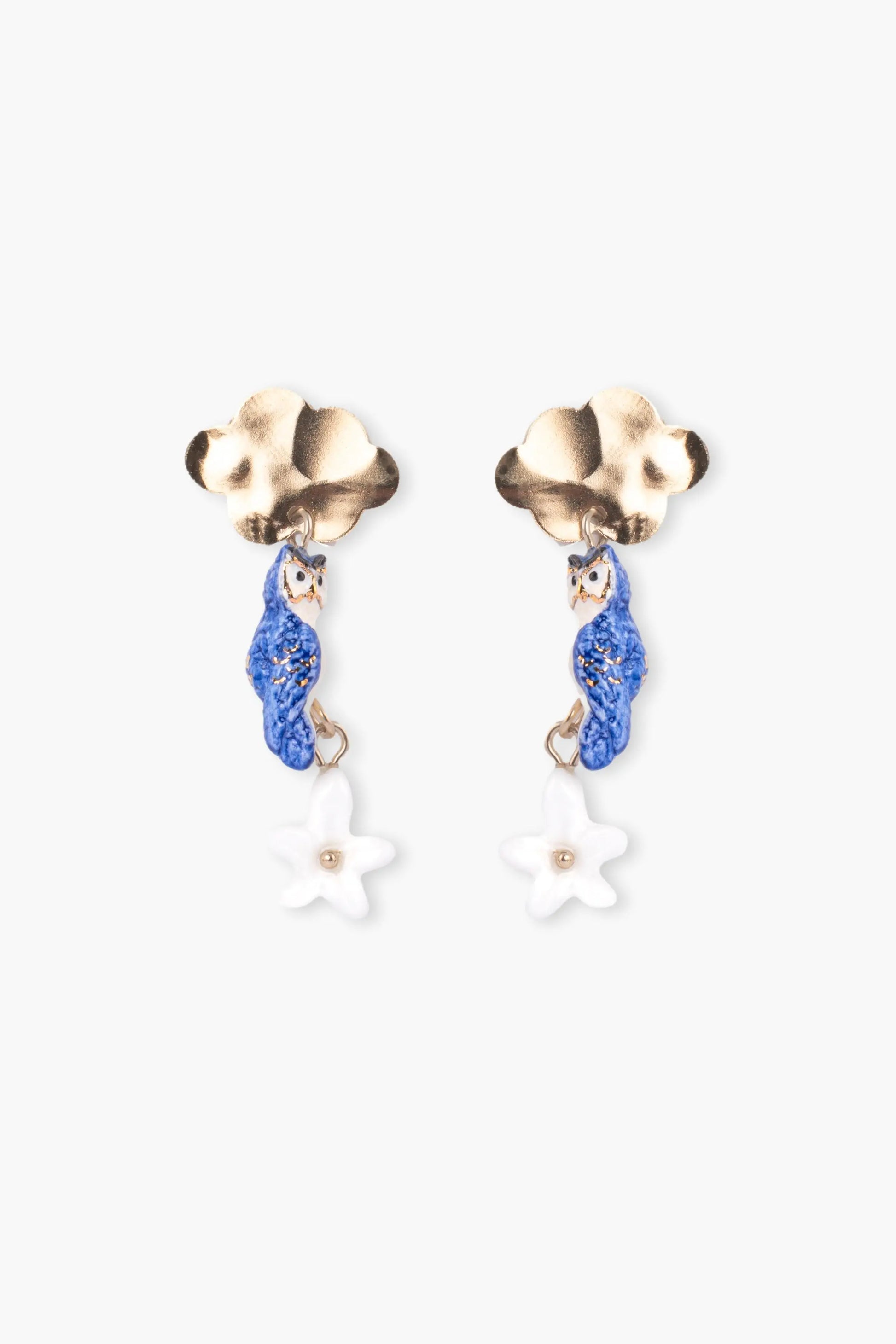 Cloud, owl and jasmine drop earrings