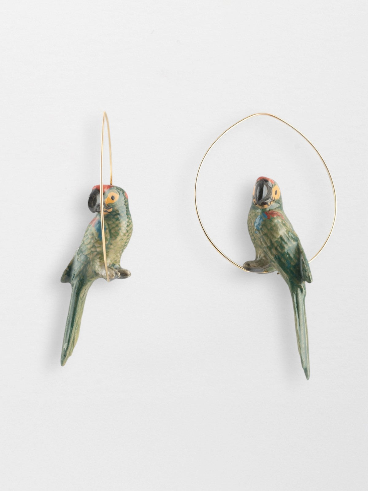 Grandi orecchini a cerchio a forma di pappagallo verde