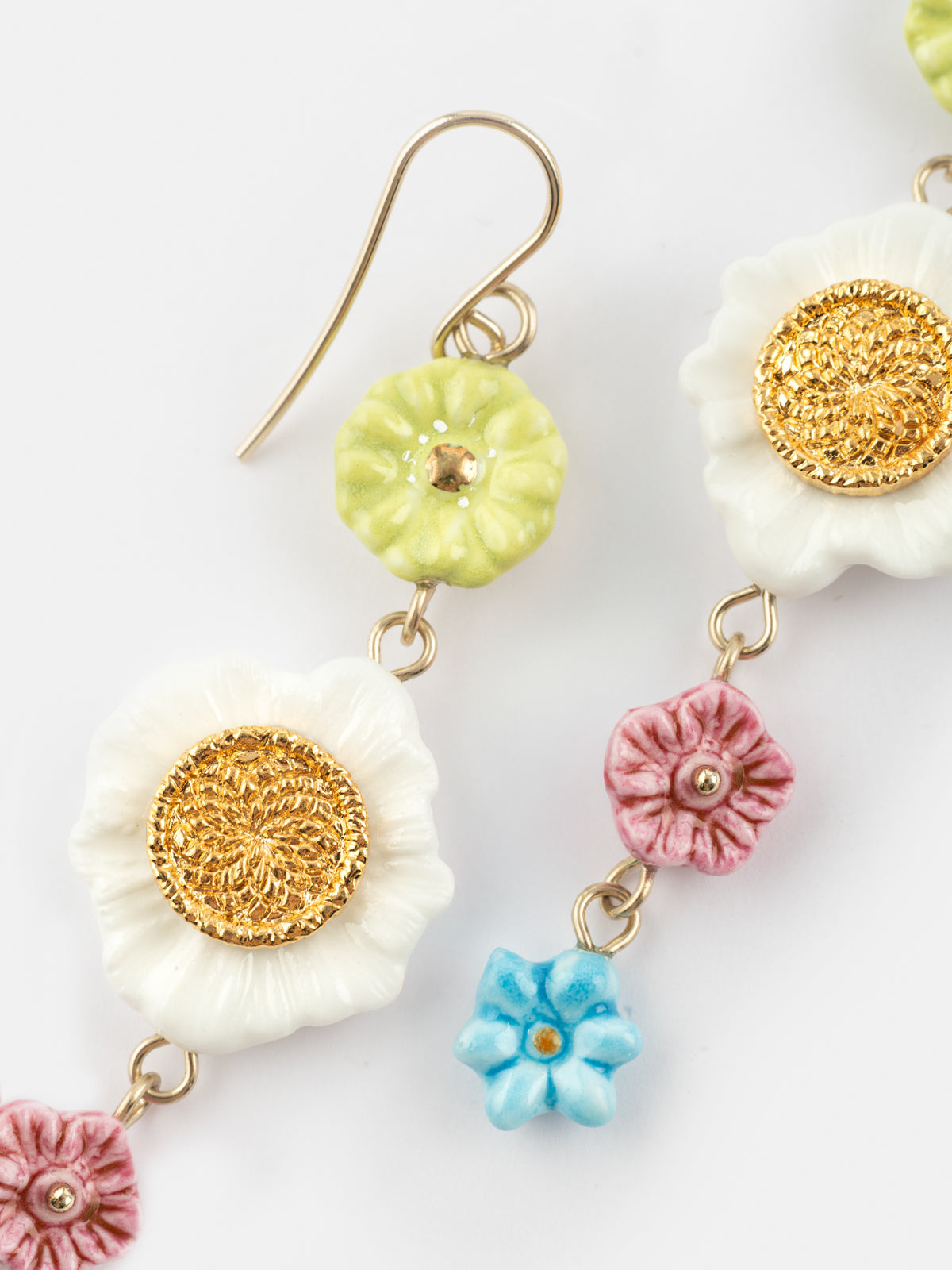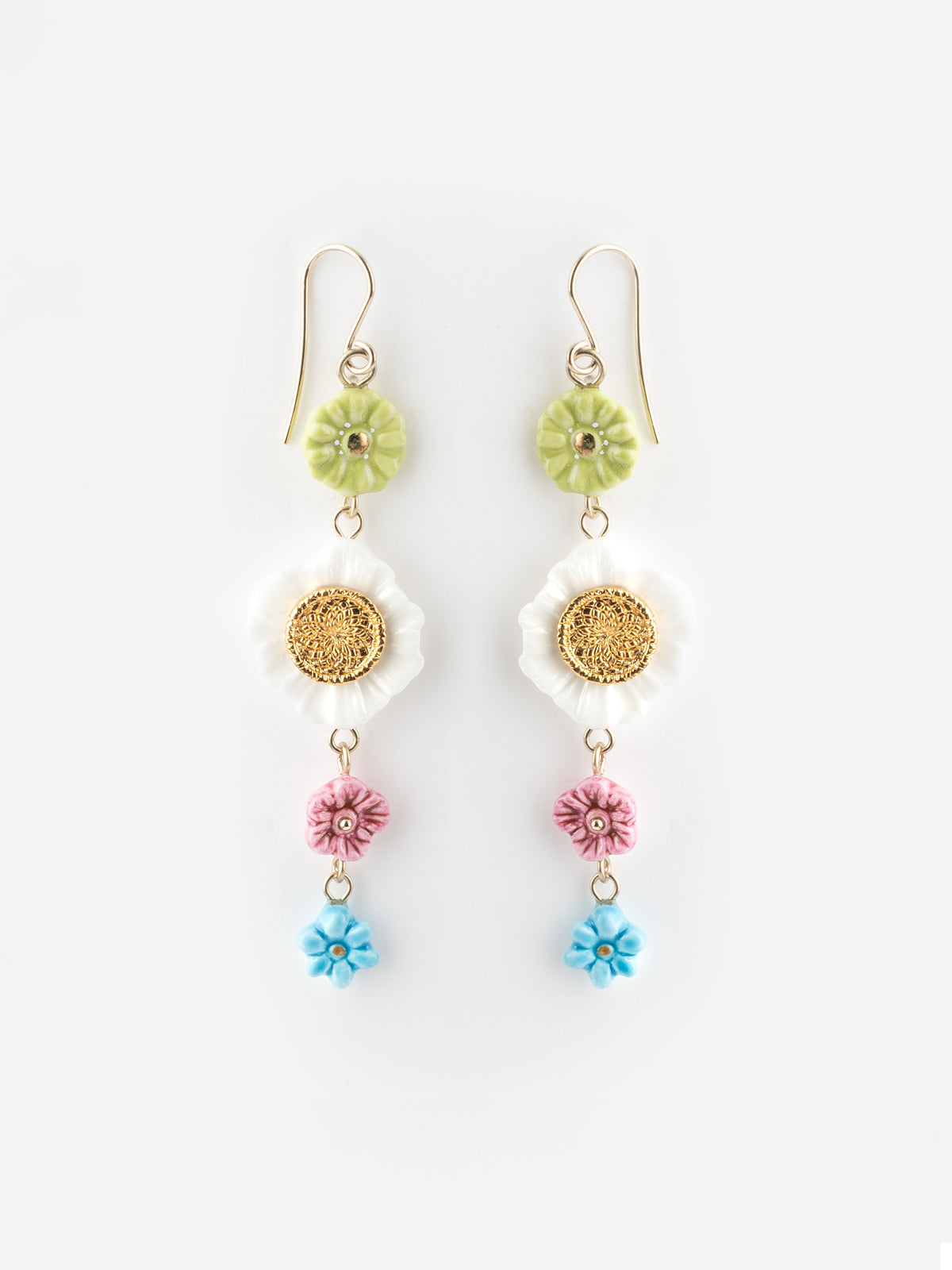 Orecchini pendenti in porcellana e ottone placcato oro. Metallo privo di nichel e ipoallergenico, di provenienza italiana.