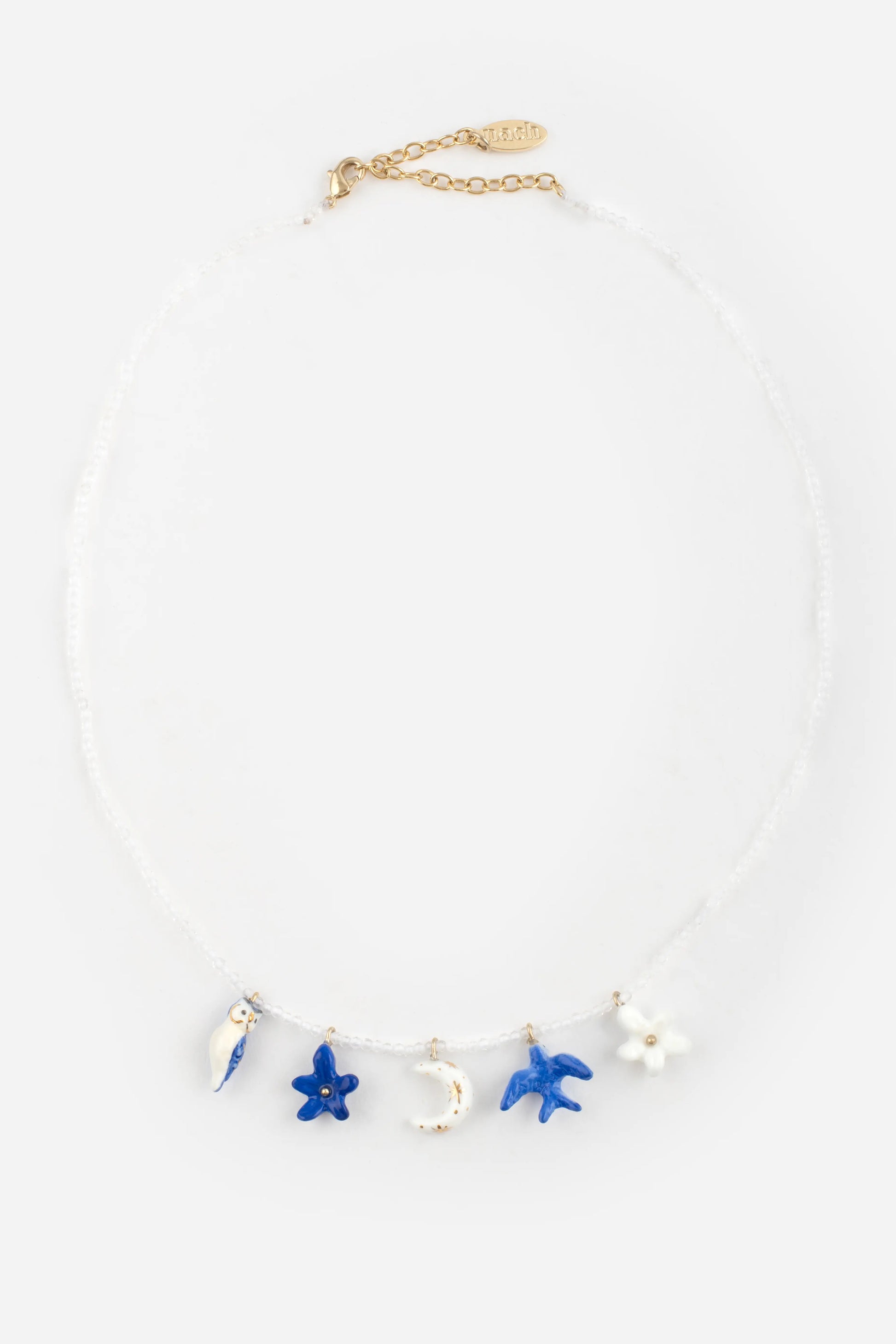 Collana realizzata in porcellana, ottone placcato oro e pietre semipreziose (cristallo di rocca). Metallo senza nichel, ipoallergenico.