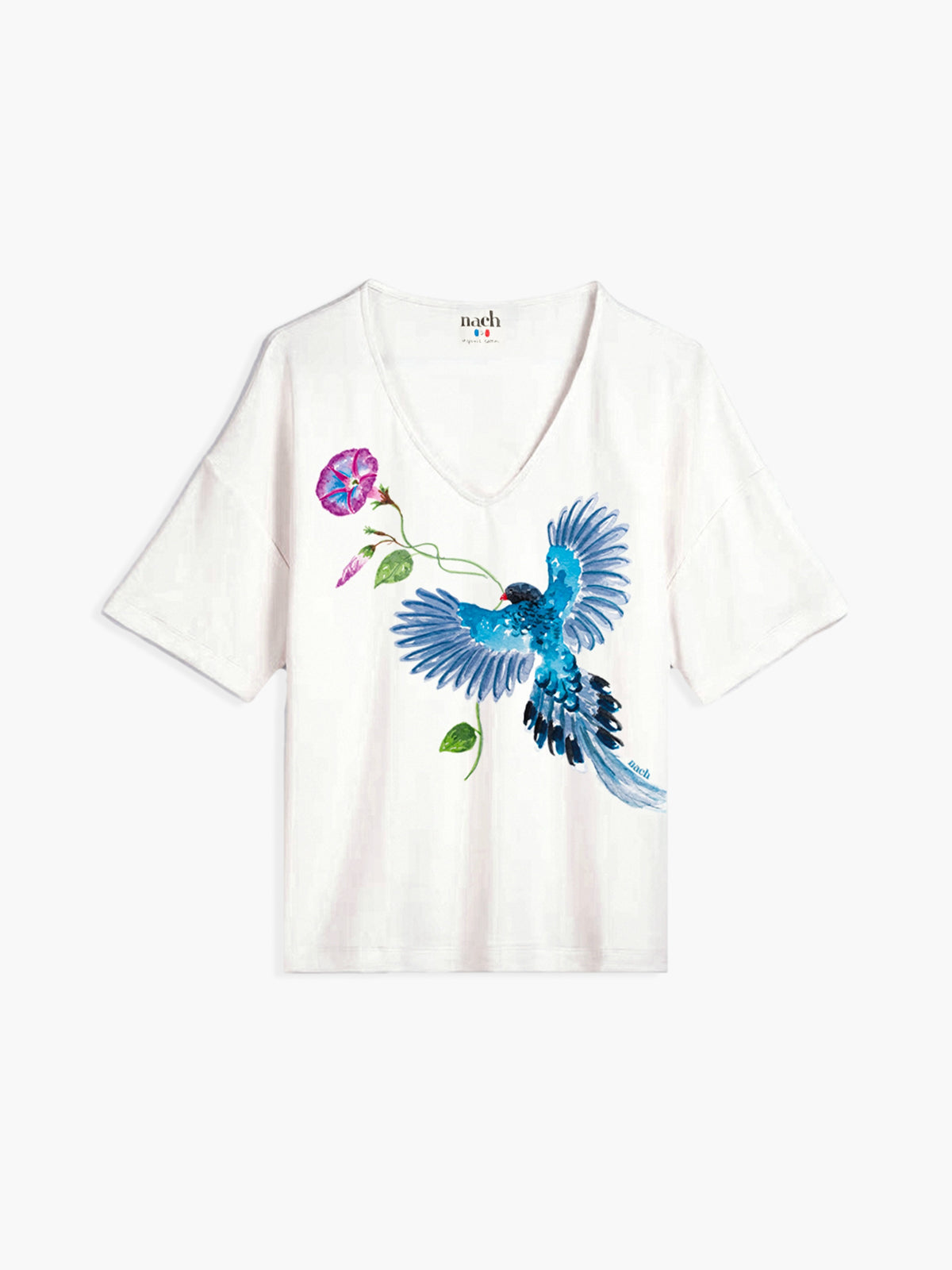 Ampia t-shirt con scollo a V e stampa piazzata. Il design raffigura una gazza taiwanese che vola nell'aria, tenendo nel becco un fiore viola cosmico, come un talismano proveniente da un'altra galassia. Un'opera d'arte da indossare.