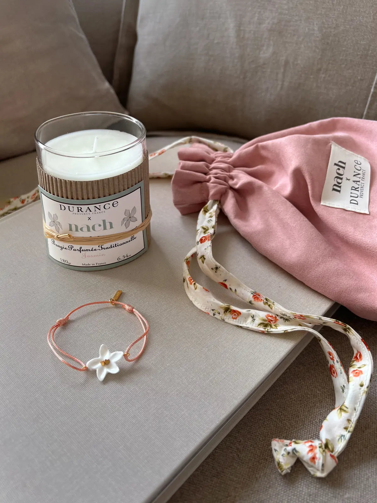 Nach a toujours eu cette envie secrète de cocréer avec Durance. Quelques mois avant le lancement de leur capsule « Jasmin et Moi » ce fut une évidence. Après plusieurs échanges et des envies communes, est né de cette collaboration un joli coffret où l’on découvre la fleur de jasmin sous tous ses angles.