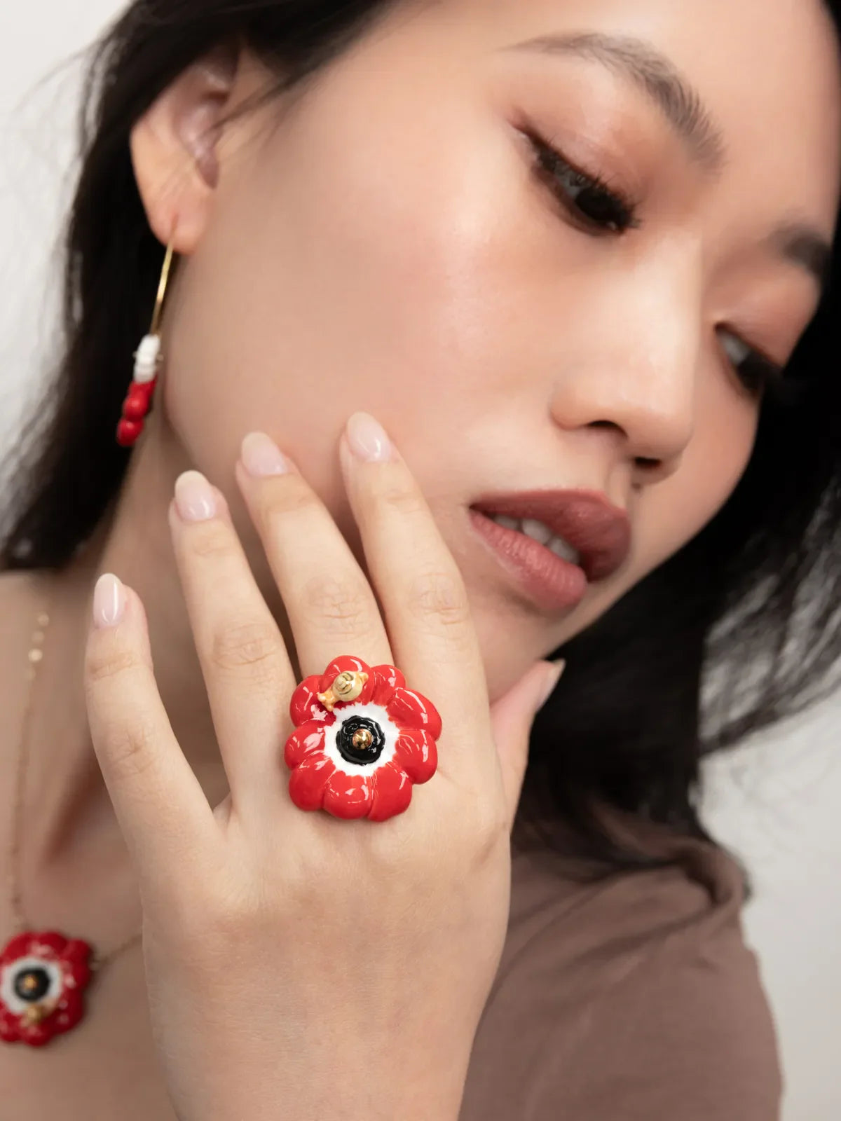 Bague ajustable en porcelaine et laiton doré à l’or fin.