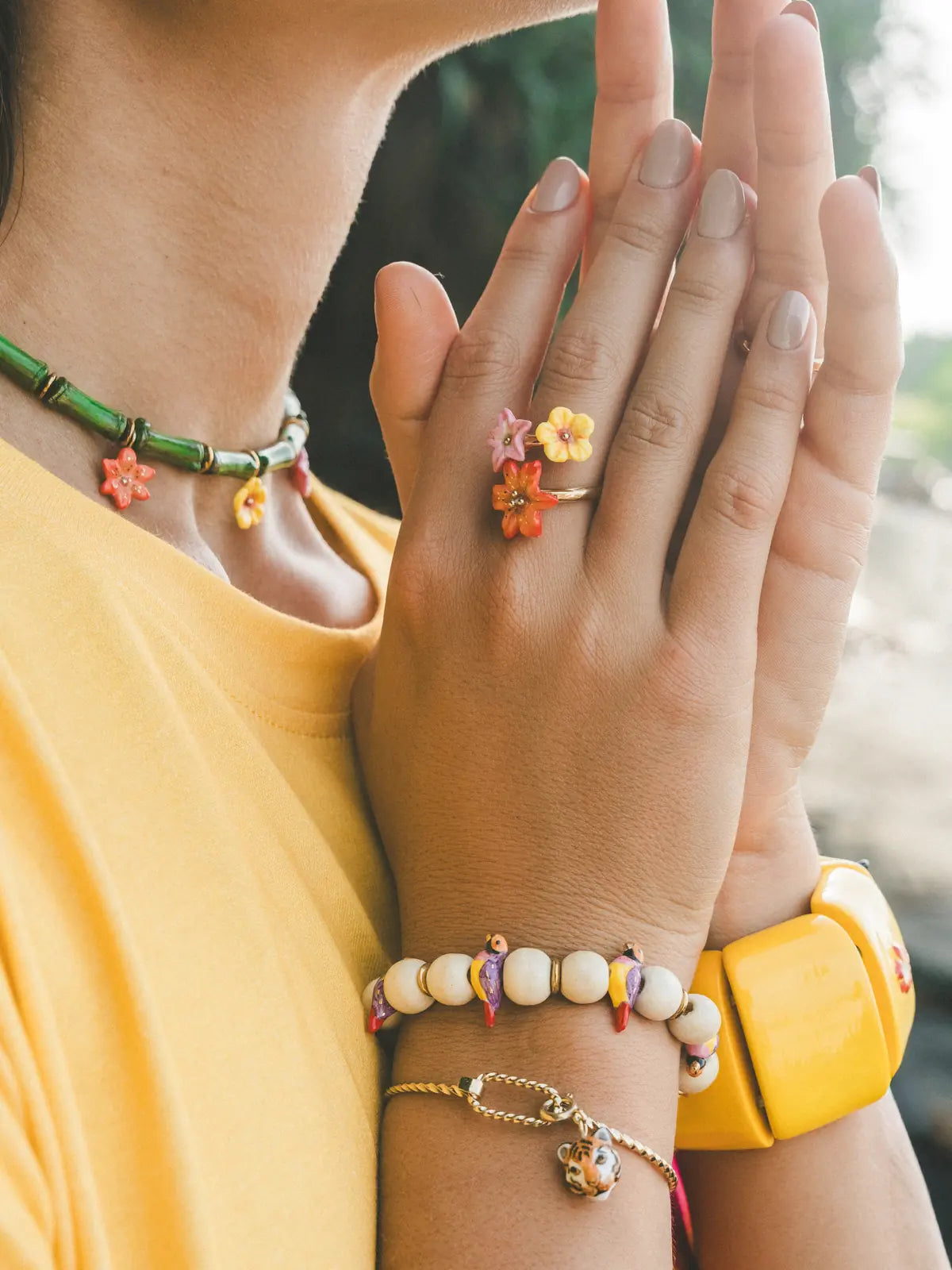 Bague ajustable en porcelaine et laiton doré à l’or fin.